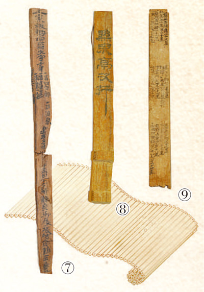 圖⑦⑧⑨:懸泉置遺址出土漢簡(jiǎn)。其中,圖⑦為郵書刺刻齒簡(jiǎn)。甘肅簡(jiǎn)牘博物館供圖