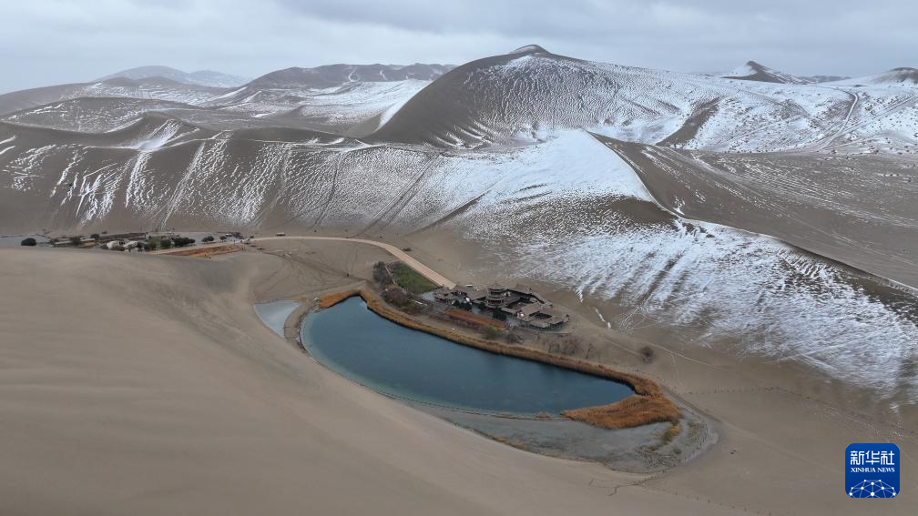 這是11月23日拍攝的敦煌市鳴沙山月牙泉景區(qū)雪景(無(wú)人機(jī)照片)。新華社發(fā)(張曉亮 攝)