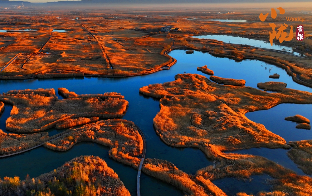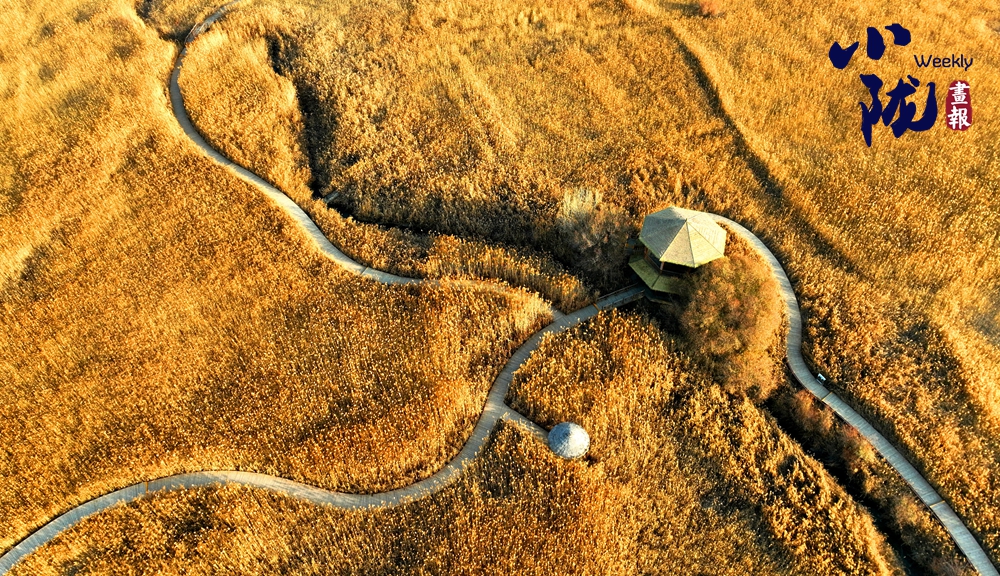 濕地天晴,碧水環(huán)繞,萬畝葦蕩一片金黃,仿佛是一幅富有層次感的油畫,令人陶醉。