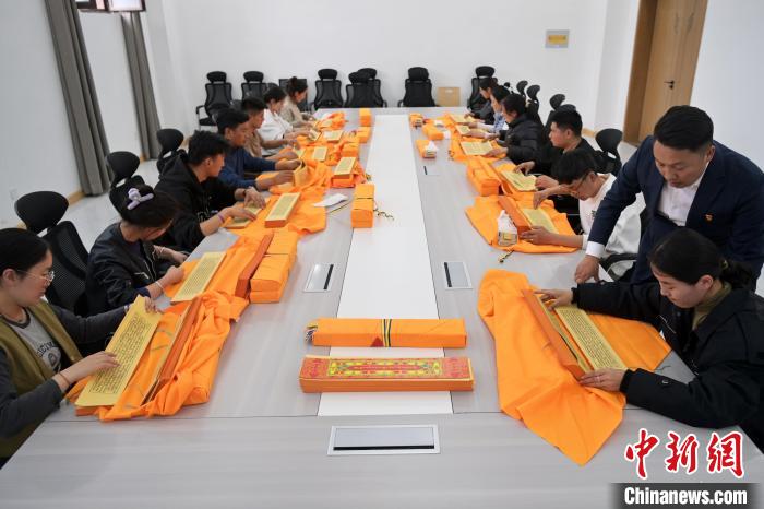 2月27日,在甘肅甘南藏族自治州碌曲縣益西達吉科技有限公司內(nèi),工作人員正在進行藏文古籍?dāng)?shù)字化相關(guān)工作。該公司主要從事民族古籍?dāng)?shù)字化建設(shè)和古籍文獻數(shù)據(jù)庫建設(shè),自2019年以來,承擔(dān)西藏、四川、甘肅等省區(qū)的藏文古籍?dāng)?shù)字化項目。圖為工作人員對藏文古籍(木刻版)做數(shù)字化工作前期準(zhǔn)備。中新社記者 九美旦增 攝