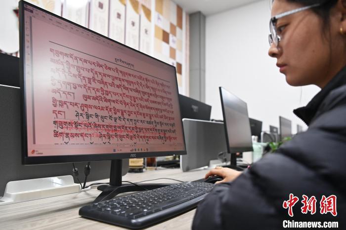 2月27日,在甘肅甘南藏族自治州碌曲縣益西達吉科技有限公司內(nèi),工作人員正在進行藏文古籍?dāng)?shù)字化相關(guān)工作。該公司主要從事民族古籍?dāng)?shù)字化建設(shè)和古籍文獻數(shù)據(jù)庫建設(shè),自2019年以來,承擔(dān)西藏、四川、甘肅等省區(qū)的藏文古籍?dāng)?shù)字化項目。圖為工作人員對藏文古籍?dāng)?shù)字化內(nèi)容進行校對。中新社記者 九美旦增 攝
