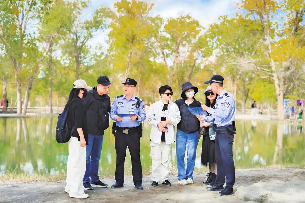 “壯美的胡楊,旖旎多姿的美景風光,讓人不知不覺醉迷其中,景區(qū)隨處可見執(zhí)勤的民輔警,在這里旅游感覺安全感爆棚!”一位來自成都的游客鄧女士說。