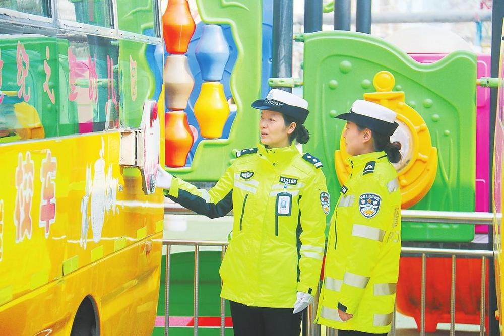 民警在檢查校車安全設(shè)施。2月19日,蘭州市公安局交警支隊(duì)七里河大隊(duì)民警走進(jìn)七里河區(qū)世紀(jì)之星幼兒園,開展校車啟封安全檢查。 新甘肅·甘肅法治報(bào)記者王輝攝
