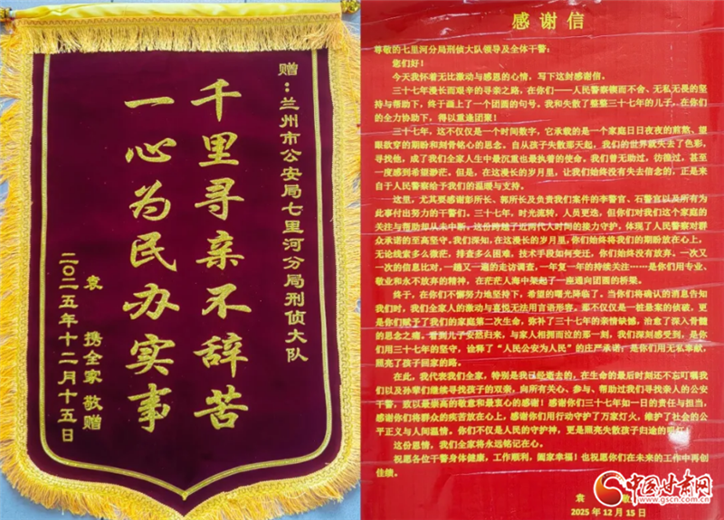 2025年12月15日,袁女士夫婦專程帶著兩面印有“千里尋親不辭苦 一心為民辦實(shí)事”的錦旗和飽含深情的感謝信,分別來(lái)到分局刑偵大隊(duì)、龔家灣派出所:“謝謝你們,幫我找回了失散半生的兒子,圓了我們?nèi)业膱F(tuán)圓夢(mèng)!”