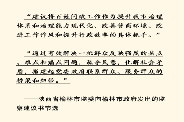 2019年12月6日,榆林市監(jiān)委制發(fā)的《關(guān)于解決百姓問(wèn)政工作中存在問(wèn)題的建議》的監(jiān)察建議書(shū)送達(dá)榆林市政府,并交于市長(zhǎng)本人。