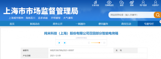 據(jù)上海市市場(chǎng)監(jiān)督管理局網(wǎng)站2021年12月9日消息,純米科技(上海)股份有限公司召回部分智能電烤箱。