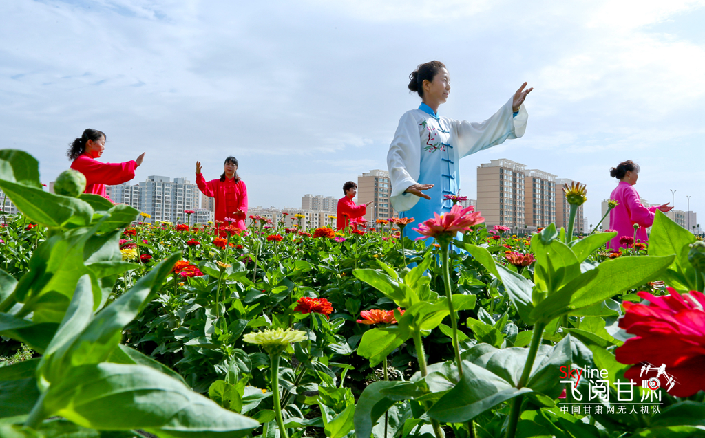 7月8日清晨,甘肅張掖甘州區(qū)順祥名苑小區(qū)南側(cè)的123畝裸露土地綠化美化點上,各種鮮花競相綻放,花香四溢,綠意盎然,太極拳練習愛好者正在練習太極拳。