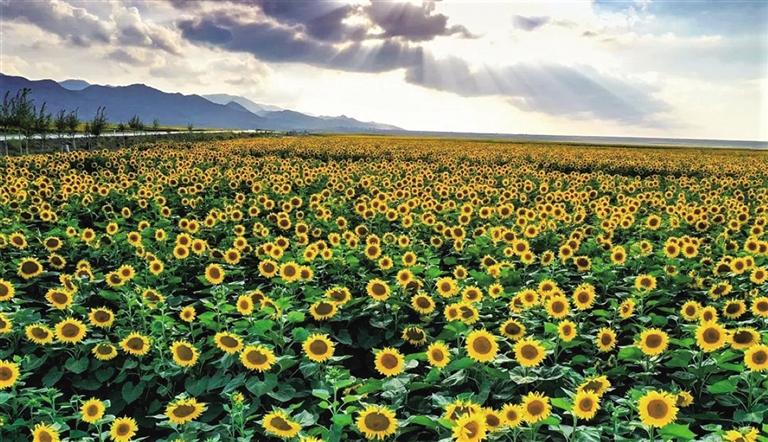 時下,位于白銀市景泰縣寺灘鄉(xiāng)境內(nèi)的永泰川戈壁灘,萬畝滴灌的旱砂田里葵花盛開,斜陽之下猶如一幅金色畫卷。