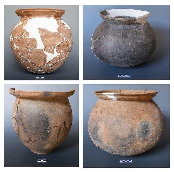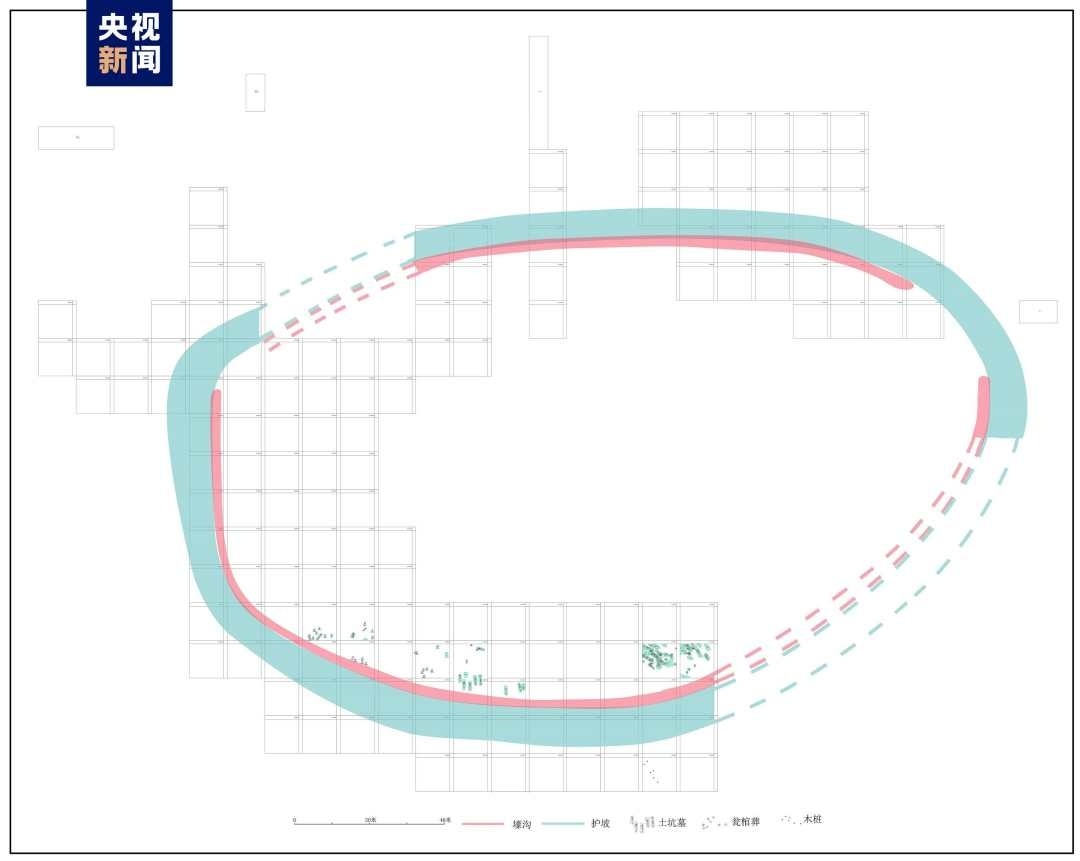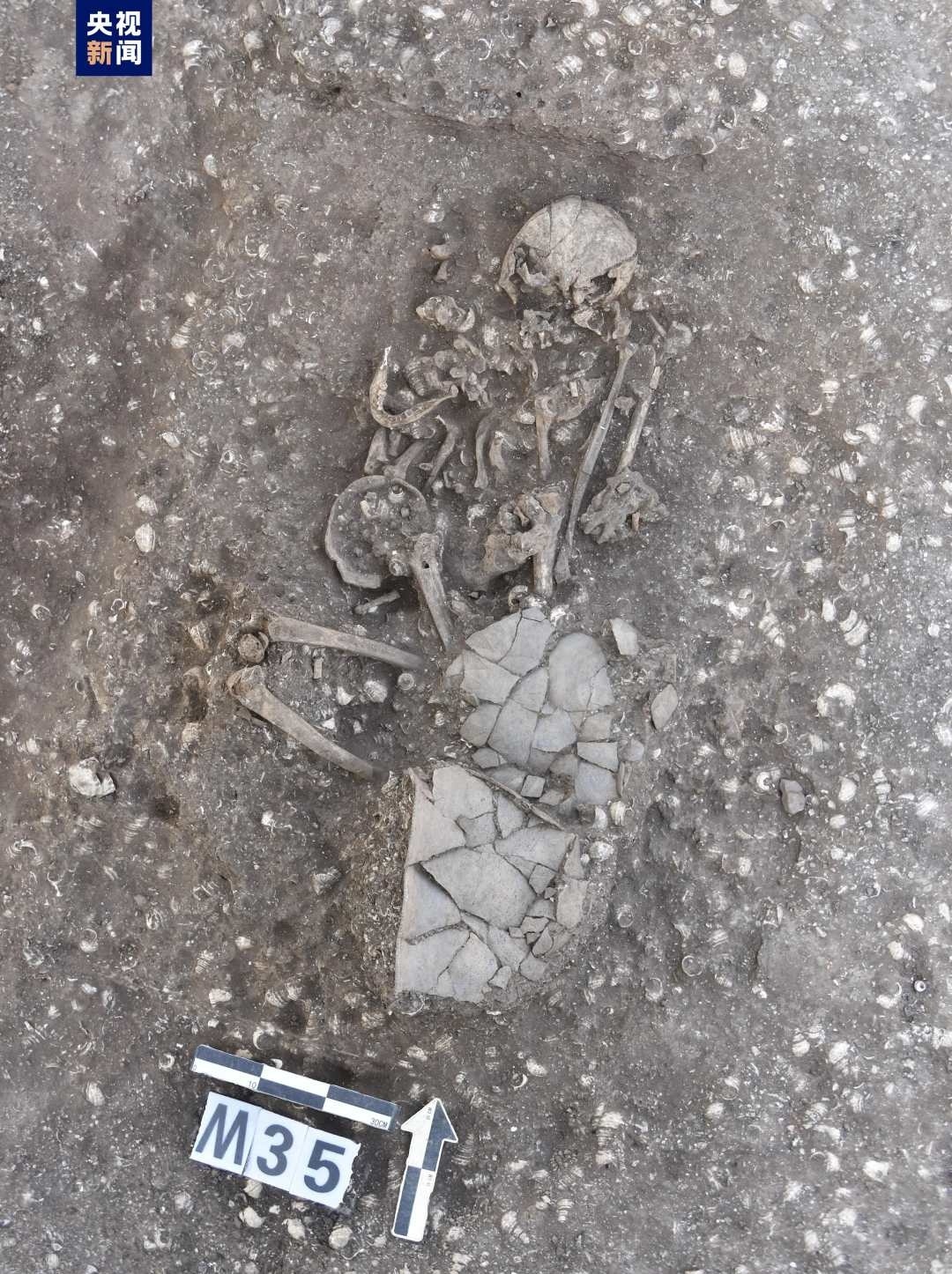 古城村遺址面積約4.2萬平方米,現(xiàn)存的貝丘堆積最厚處達6.5米,由大量尾部被敲破的螺螄殼與灰土層交替堆疊形成。碳十四測定年代為距今3600至2500年,約相當于中原地區(qū)的商代至兩周時期。商代遺存可分為早晚兩段,早段發(fā)現(xiàn)保存完整的橢圓形環(huán)壕聚落,由中心臺地、外圍環(huán)壕和護坡組成,中心臺地面積約27000平方米,環(huán)壕和護坡周長約600米,這種聚落格局一直延續(xù)至兩周時期。商代晚段發(fā)現(xiàn)一批土坑墓和甕棺葬。兩周時期的遺存以房址、螺殼堆、灰燼、活動面等居住類遺跡為主,房址多為方形半地穴式。出土青銅器、陶器、玉器、石器、骨器、木器等文物4000余件。