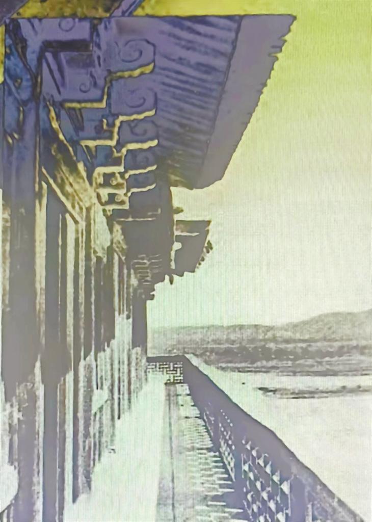 林競《西北叢編》一書載,其與蘭州友人于1919年2月7日出游雷壇河臥橋,“橋長十余丈,其形如弓,橋上蓋屋,足蔽風(fēng)雨,五彩繪畫,兩端有坊,東曰‘空中鰲背’,西曰‘天上慈航’,橋底無墩,自遠(yuǎn)望之,宛如臥龍。”林競還詳細(xì)記錄了蘭州雷壇河臥橋的建造方法,并對之科學(xué)性表示肯定:“聞此橋原來有墩,因某年山洪爆發(fā),被其沖毀,自是始改今式。其法,先將兩岸之橋基筑好,以數(shù)丈長之巨木直列成排,復(fù)以橫木連之,木材之?dāng)?shù),依橋之寬狹而定,其前端伸出橋中約二三尺,其后端即以巨石壓之,如是疊架不已,每加一層,即前端伸過下層數(shù)尺,如倒掛之階梯然。而層與層之間,復(fù)聯(lián)以鐵環(huán)及釘木,迨兩岸相距不遠(yuǎn)時,即以巨木渡之。此種構(gòu)造,在西北往往因河水湍急,不能筑墩,或游牧之民,不知在河中建筑橋墩之法而始用之。然亦甚合於力學(xué)原理,未可忽視也。”