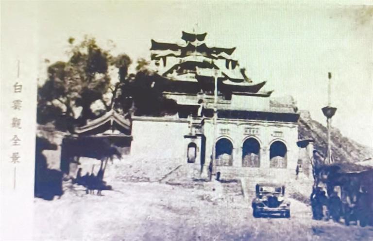 1935年5月,邵元沖考察西北途經(jīng)蘭州,專程赴崔家崖白云觀參訪?!段鞅彪S軺記》載:“依極壽山麓,建白云觀,高三百余級,黃流襟帶,榆柳成蔭,書長無事,凝坐其間,聆水聲潺湲,聽鳥語啾啁,亦足滌塵煩,消炎夏。”邵元沖為此特作《題崔家崖白云觀》詩曰:“玄都峙重崖,清磬林間響。俯瞰大河橫,寒流走混□。柳晚翠煙浮,閑云獨(dú)來往。”《西北攬勝》一書中,專門刊載兩幅崔家崖白云觀照片,照片說明曰:“北臨黃河,南接蘭山,形勢雄壯,殿宇倚坡上筑,宏麗精巧,且曲徑回廊,引人入勝,亦蘭垣名勝之一也。” 從老照片中可見,崔家崖白云觀依山而建,頗具氣勢,而且交通便利,邵元沖一行乘坐的小汽車可以直達(dá)觀前。
