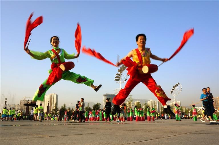 第一表演區(qū):奧體中心主會場廣場,表演內(nèi)容:太平鼓、扇子舞、健身秧歌“黃河蘭州”、啦啦操;