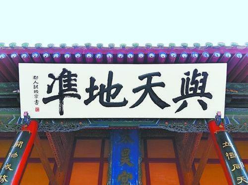 “與天地準”出自《周易·系辭傳上》。原句為:“易與天地準,故能彌綸天地之道”。準,意為等、等同(此依高亨解)。有學者或?qū)?ldquo;準”解釋為標準,或解釋為法則等,唯高解最貼原意;彌,意為遍,普遍;綸,意為絡,包絡。彌綸,意即普遍包絡。此句可釋為:《易》所闡述的“性命之理”是與天地運行的自然法則等同的,所以它能夠包容天地之間萬事萬物的運行規(guī)律。匾文“與天地準”,是贊頌伏羲首創(chuàng)的八卦,高度概括了天地萬物運行之規(guī)律,為人們認識世界、改造世界提供了思想武器。
