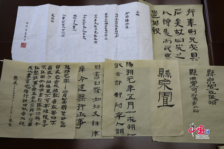 7月31日,蘭州大學(xué)古文字學(xué)強(qiáng)基計(jì)劃同學(xué)展示臨摹簡(jiǎn)牘的書法作品。中國(guó)網(wǎng)記者 鄭偉 攝