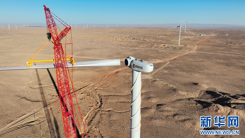 隆冬季節(jié),在甘肅省張掖市甘州區(qū)平山湖風(fēng)電基地國(guó)家電投10萬(wàn)千瓦風(fēng)電項(xiàng)目建設(shè)工地,工人正在進(jìn)行風(fēng)機(jī)葉片吊裝作業(yè)。