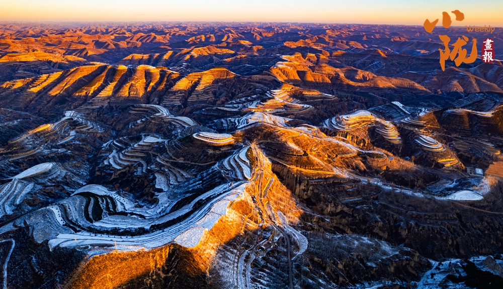 俯瞰雪后華池,溝壑縱橫的黃土高原披上銀裝,陽光斜照雪野之上,投下深淺交錯的光影,靜謐中流轉著溫柔的明暗,純凈而遼遠。