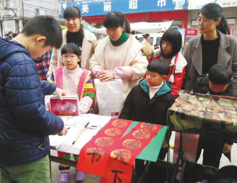 疫情之前,王子悅(左一)在集市上寫(xiě)對(duì)聯(lián)送給借書(shū)的小朋友。
