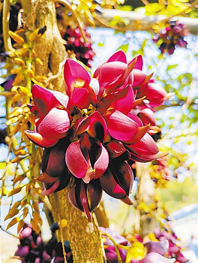 我終于登上山巔,來到那個(gè)罕見的常春油麻藤家族旁邊,眼前的景象,比我想象的更震撼。傷痕累累的蒼勁老藤猶如飛龍騰空而起,盤旋而上。只是,眼前的飛龍,是一條掛滿鮮花的飛龍。成千上萬的花朵,密密麻麻包裹著幾根老藤,每一朵,都像是紫色的飛鳥。這些花不是同時(shí)開放的:最早的已經(jīng)掉在地上,就像一群小鳥落地休息;更晚的還沒有吐出花蕊,像是巢中幼鳥,還在閉眼做夢(mèng);數(shù)量最多的,正迎風(fēng)怒放,雖然是陰天,但透進(jìn)樹林的弱光,讓它們格外明亮。