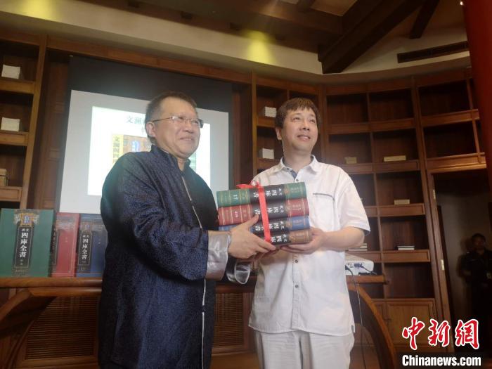 中新網(wǎng)杭州8月26日電(童笑雨)8月26日,浙江圖書館(下稱“浙圖”)向中國國家圖書館(下稱“國圖”)贈(zèng)送影印精裝本文瀾閣《四庫全書》。據(jù)悉,影印本文瀾閣《四庫全書》入藏國圖,尚屬首次。浙江圖書館館長褚樹青表示,文瀾閣本《四庫全書》重新回到北京,是浙江人民的回贈(zèng),也是一次文化交流。
