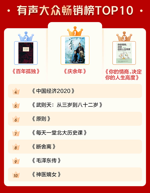 通過電子書暢銷榜TOP10和有聲暢銷榜TOP10可以看出,很多人愈發(fā)關(guān)注投資和管理等方面的內(nèi)容,也愈發(fā)注重個(gè)人學(xué)習(xí)?!秲r(jià)值:我對投資的思考》《蘇世民:我的經(jīng)驗(yàn)與教訓(xùn)》 分別位居電子書暢銷榜第一名和第二名?!吨袊?jīng)濟(jì)2020》《原則》進(jìn)入有聲暢銷榜前十。此外,學(xué)習(xí)類圖書《Python編程:從入門到實(shí)踐》《漫畫算法:小灰的算法之旅(Python篇)》也上榜電子書暢銷榜前十。