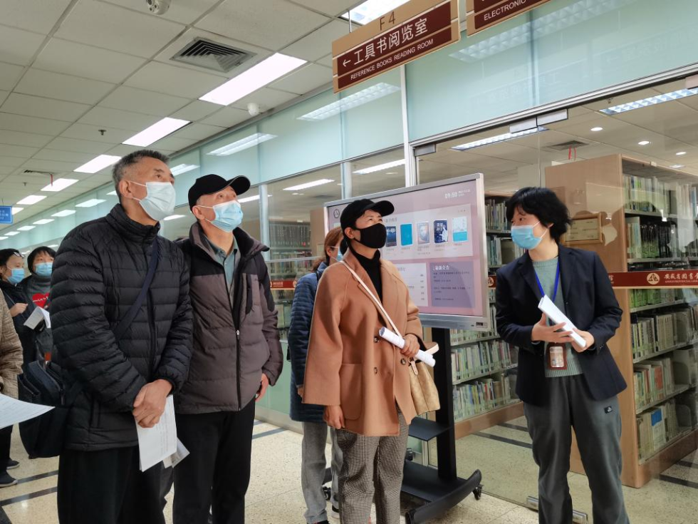 圖書(shū)館里的志愿者老師帶領(lǐng)老人游覽圖書(shū)館,并用英語(yǔ)進(jìn)行講解。新華社記者汪海月攝