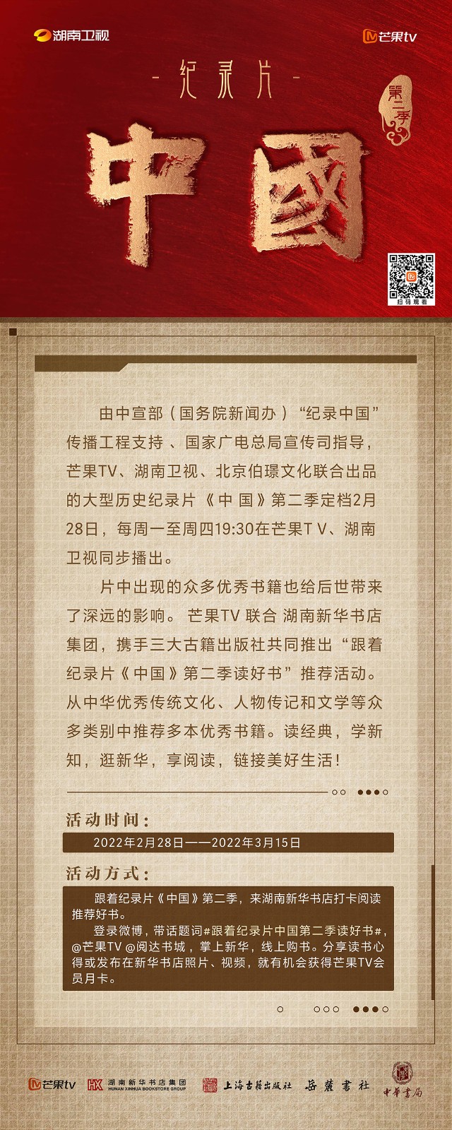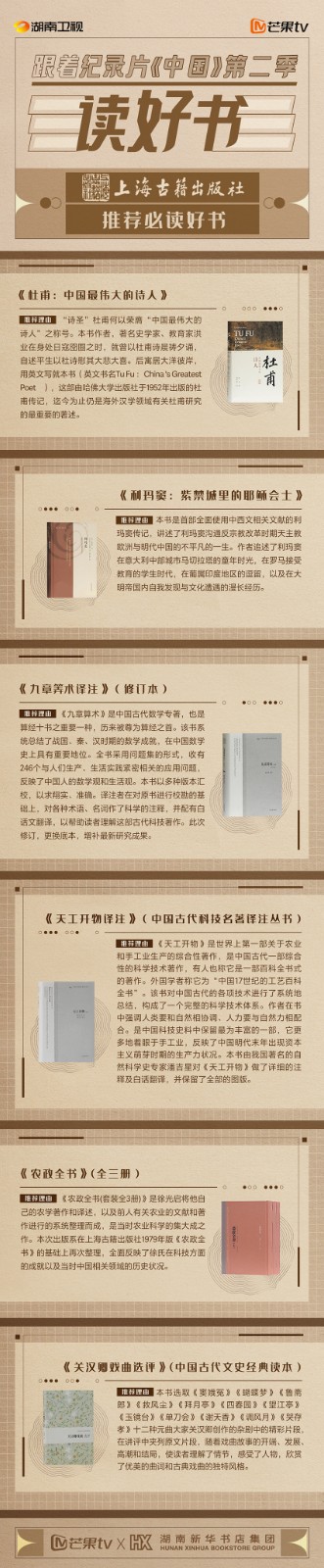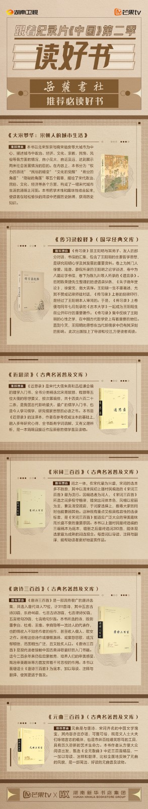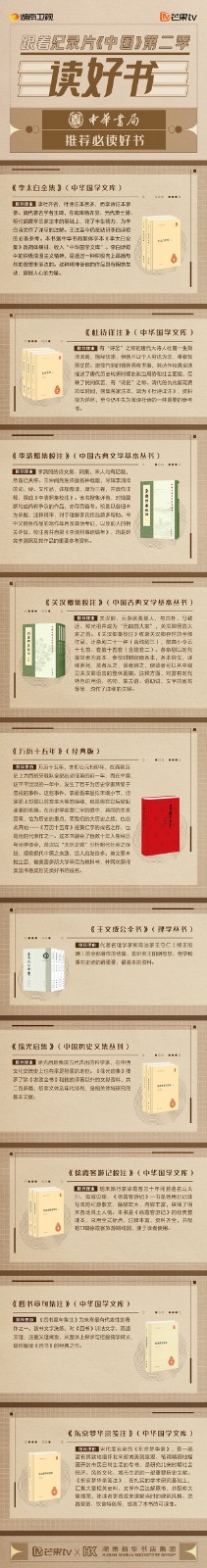 芒果TV以紀(jì)錄片《中國(guó)》第二季的精美品質(zhì),聯(lián)合湖南新華書(shū)店集團(tuán)的美譽(yù)口碑,將中華書(shū)局、上海古籍出版社、岳麓書(shū)社推薦的珍品好書(shū),傾情向大眾推薦。本次“跟著紀(jì)錄片《中國(guó)》第二季讀好書(shū)”活動(dòng),將從2月28日持續(xù)到3月15日,湖南新華書(shū)店集團(tuán)旗下湖南圖書(shū)城、不吝Boolink書(shū)店、全省市級(jí)中心門(mén)店、長(zhǎng)沙地區(qū)樂(lè)之書(shū)店等全員參與,推薦紀(jì)錄片《中國(guó)》第二季。書(shū)友及觀眾可登錄微博或到線(xiàn)下門(mén)店打卡參與活動(dòng)。