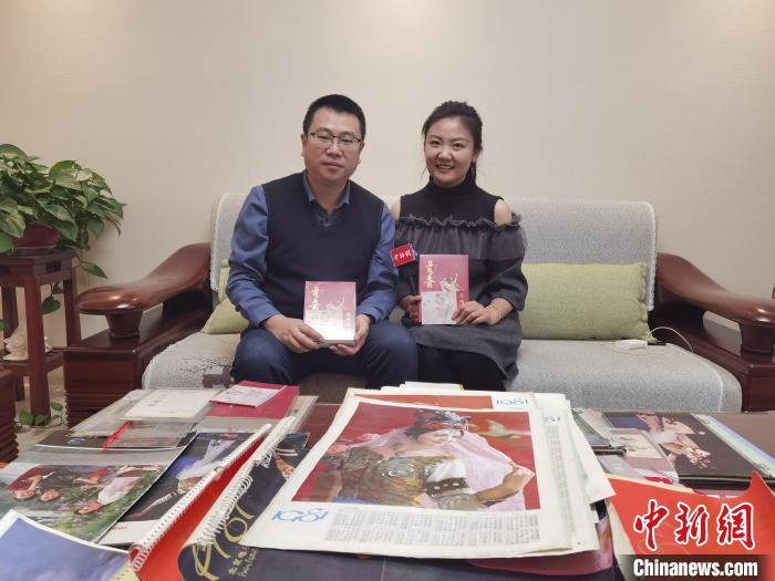 圖為陳曉斌(左)向中新網(wǎng)記者介紹他所收藏的舞劇《絲路花雨》相關珍貴資料情況?!〈蘖?nbsp;攝