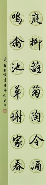 庭柳籬菊陶令酒,鳴禽池草謝家春。 釋文:庭前柳樹,籬邊菊花,陶淵明飲酒于此,怡然自得;池塘里長滿了春草,樹上的鳴鳥冬去春來,謝靈運因此寫出了這樣的千載名句。韓宗岳(滿族)