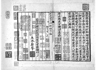 范景中先生曾見過謝蘭墀擺印本《唐宋文醇》,是書“正文用墨印,墨點(diǎn)用朱印,御評(píng)用黃印,朱子評(píng)用朱印,各家評(píng)用藍(lán)印,實(shí)為四色套印”。至于《唐宋詩(shī)醇》,范先生認(rèn)為是木活字五色套印。其主要依據(jù)是《詩(shī)醇》凡例云:“評(píng)語(yǔ)悉準(zhǔn)《唐宋文醇》之例,色別書之,但其中有援據(jù)正史雜說用資考訂疏解者,與古今人評(píng)詩(shī)之語(yǔ)義各有在,《文醇》未經(jīng)區(qū)別,今于藍(lán)筆之外,另作綠筆書,以便閱者,燦若列眉。”按照凡例的說法,《詩(shī)醇》在《文醇》朱、墨、黃、藍(lán)的基礎(chǔ)上又加了綠色,由此可知是五色套印本。實(shí)際上《唐宋詩(shī)醇》中并無康熙御評(píng),因此未用黃色。湖南省圖書館藏有一部謝蘭墀擺印本《唐宋詩(shī)醇》,八冊(cè),四十七卷全。我們委托張諾丕同學(xué)代檢全書,亦僅朱、墨、藍(lán)、綠四色而已,由此可知楊成凱先生所說四色套印本是正確的,而《增訂四庫(kù)簡(jiǎn)明目錄標(biāo)注》著錄的五色套印本恐不可信。