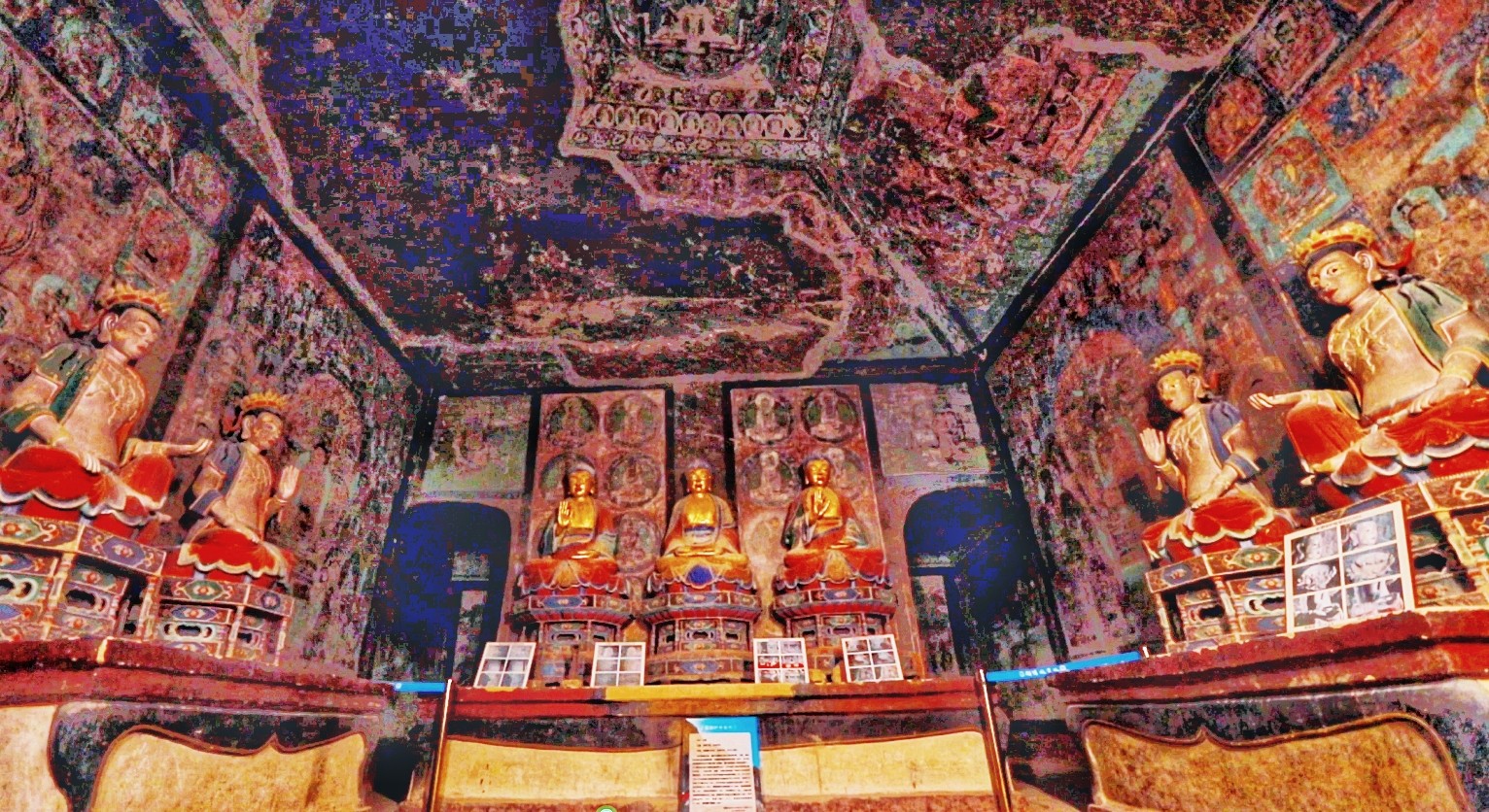 東千佛洞因地理位置相較于敦煌西千佛洞,故名東千佛洞,又因西夏7號窟前室東西壁對稱彩繪《接引佛祖》各一幅,故又名“接引寺”。初創(chuàng)于唐,五代、西夏、元、清各代增修,逐步形成較大規(guī)模的石窟群,現存23窟,以內容豐富、技藝精湛的西夏壁畫稱絕于世,其密宗佛教壁畫填補了敦煌莫高窟壁畫藝術的空白。