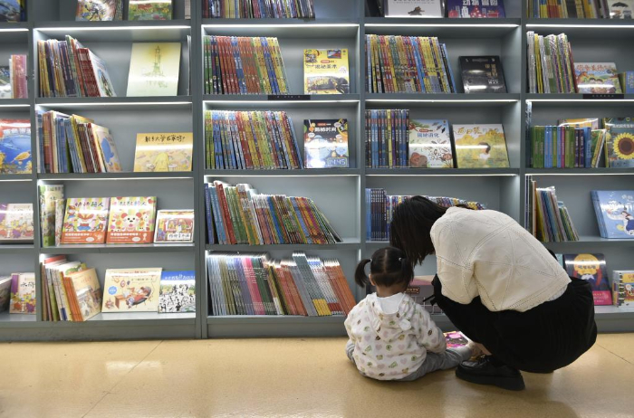 10月18日,家長帶著小朋友在鄭州市緯五路第一小學(xué)校園閱讀中心內(nèi)閱讀。