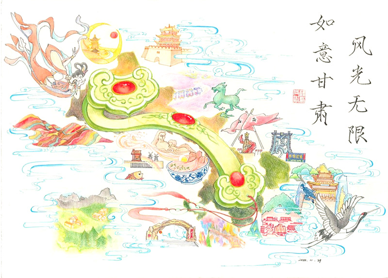 筆者作為編者之一,在一開始接觸到“如意甘肅”這個概念時,就感受到了一種撲面而來的畫面感和強(qiáng)烈的色彩張力,而在精讀《如意甘肅》的過程中,這種感覺愈發(fā)清晰和強(qiáng)烈,一幅黃土高原、廣袤草原、茫茫戈壁、潔白冰川為底色,十四個市州的人文自然美景簇?fù)憝h(huán)繞,一柄通體翠綠、晶瑩無瑕的“玉如意”居中凝型,璀璨奪目的文化如點點紅寶石鑲嵌其中的構(gòu)圖呼之欲出。隨著理解認(rèn)識的逐步深入,本書喚起了我的思想共鳴和對家鄉(xiāng)深沉熱烈的情感流動,并繪制了這幅印象畫,以填補文字和語言所不能盡興之處。我真切地希望,隨著《如意甘肅·甘肅省情研究》的發(fā)行和推廣,隨著美好甘肅的不斷發(fā)展和進(jìn)步,在未來,人們心中的甘肅,不再是“苦瘠甲于天下”的荒涼意象,而是這柄溫潤澄澈、莊重堅實的“玉如意”,和圍繞著、托舉著它的那些繽紛美景和璀璨文化!