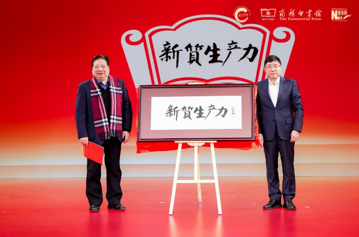 中國辭書學(xué)會(huì)會(huì)長、北京語言大學(xué)教授李宇明(左),中國出版集團(tuán)有限公司副總經(jīng)理、黨組成員陳永剛(右)揭曉年度國內(nèi)詞“新質(zhì)生產(chǎn)力”。新華網(wǎng) 發(fā)