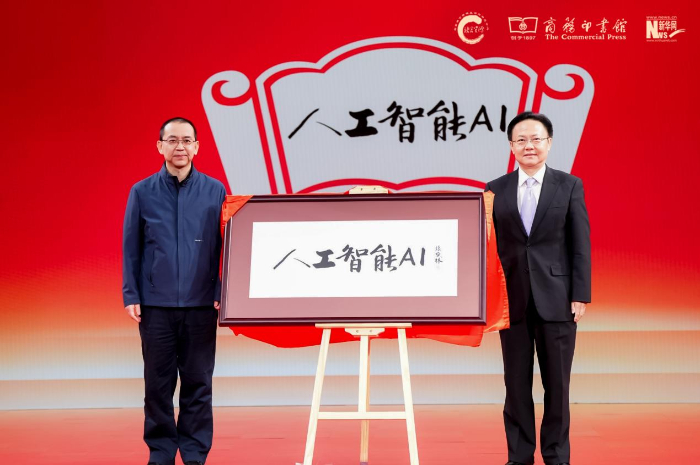 商務(wù)印書館副總經(jīng)理陳晗雨(左),中宣部“學(xué)習(xí)強(qiáng)國”學(xué)習(xí)平臺(tái)編委、副總經(jīng)理杜大力(右)揭曉年度國際詞“人工智能(AI)”。新華網(wǎng) 發(fā)