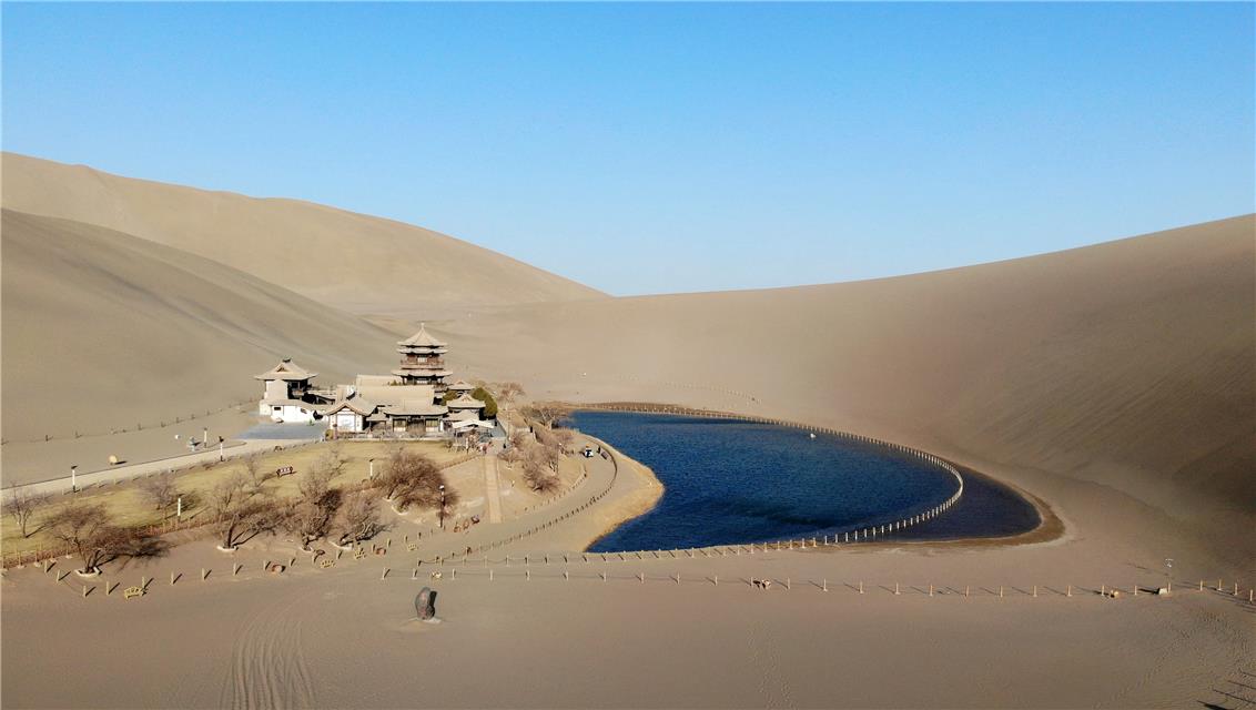3月17日拍攝的甘肅省敦煌市鳴沙山月牙泉景區(qū)(無(wú)人機(jī)照片)。張曉亮攝