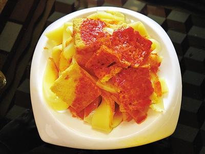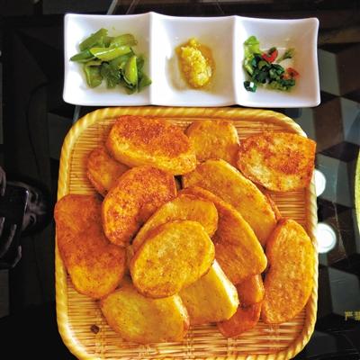 炕鍋洋芋是臨夏農(nóng)家樂里面常見的一道特色小吃,在臨夏,煎、烙之類的烹飪方式都被稱作炕,炕鍋洋芋因此得名。洋芋切片后,直接放熱油中兩面煎透??诲佈笥蟮淖龇m不復雜,但其對于火候的要求卻極其嚴苛,多一分會焦,少一分則不熟。