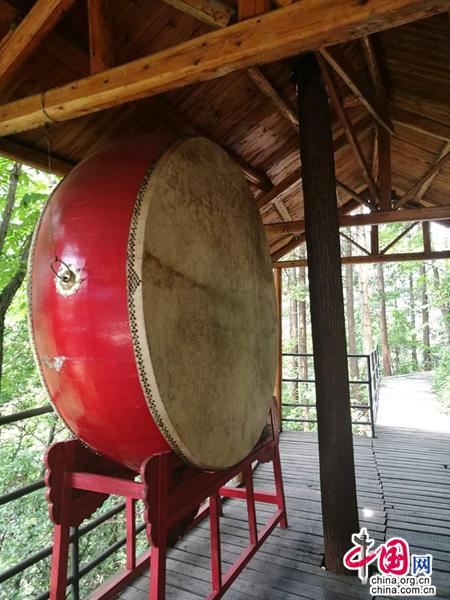 不知是何等神力相助,我竟然氣不急喘,腿不灌鉛,一口氣沖到了大鐘處。在一處長(zhǎng)約兩百米,寬約五六米的突兀石崖下,竟然有一條長(zhǎng)百米寬約三米的平坦棧道,直抵懸崖石壁,仿佛一條地道的天街。從懸崖上吊掛下來(lái)一尊重達(dá)千斤的銅鐘,鐘邊吊一根木質(zhì)鐘錘,錘身已裂開(kāi),兩頭均被撞成起毛的“絨團(tuán)”,由此可知,到達(dá)此處撞鐘的勇士并非少數(shù)。我乘興上去重重地撞了九下,雄渾、恢弘的鐘聲,在峽谷上空久久地回蕩。