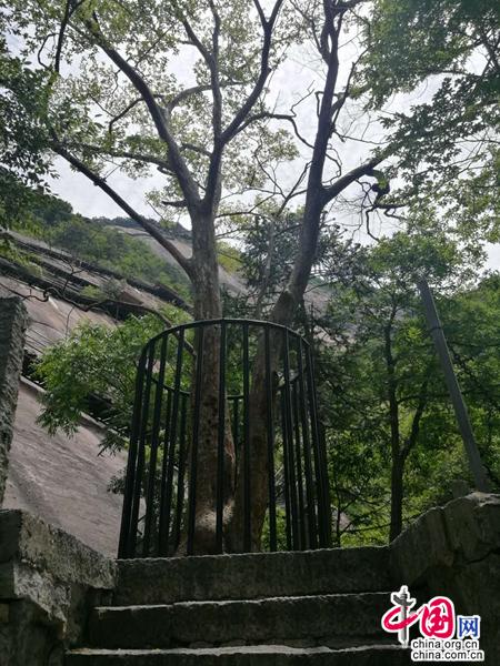 于是,我開(kāi)始沿著陡峭的石階,一步一步地向上攀登。上不過(guò)百余級(jí),一株如巨傘狀的天目紫莖躍然眼前。樹(shù)四周用茶杯粗細(xì)鋼筋柵欄緊緊圍住,可見(jiàn)景區(qū)對(duì)此珍貴名木的重視。仔細(xì)觀察,估計(jì)樹(shù)齡至少在500年以上,其主干樹(shù)皮細(xì)滑,骨感十足,上部枝丫自然舒展,覆蓋出去,周圍各色綠樹(shù)恰似眾星拱月般,與其相擁成趣。