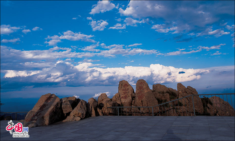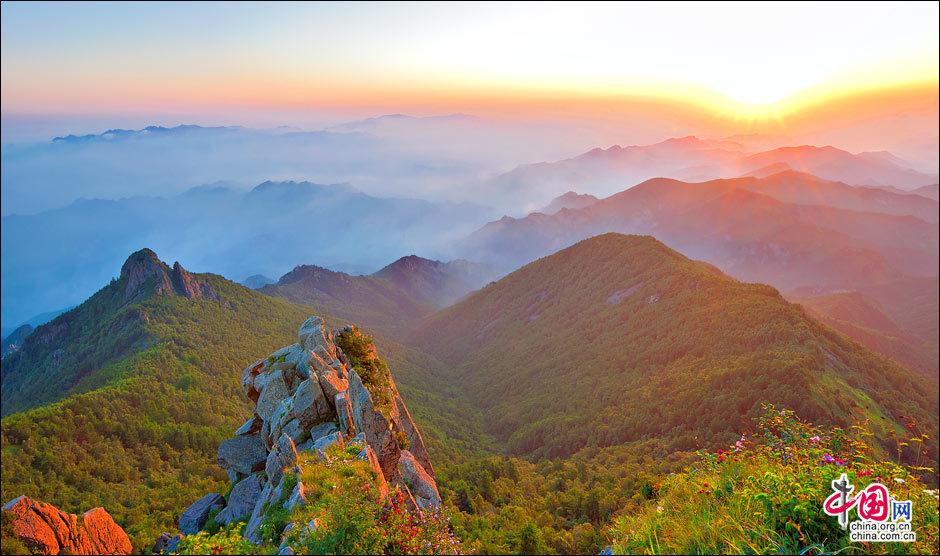 當(dāng)北京的第一縷陽光從這里升起。站在海拔2118米的頂峰平臺上,遙望東方,天際中開始露出幾抹灰色的浮云,隨后不斷地升騰、擴大,繼而天邊漸紅,紅色越來越深,范圍越來越大,曙光漸露,丹霞輝映,把整個東方都變成濃濃的紅色。山峰在云霧中時隱時現(xiàn),彩云在天際間變幻,有時像奔馳的駿馬,有時像仙女飄逸,有時像玉樹瓊宮……千姿百態(tài),遐想無窮。猛然,比紅色的彩云更火紅、更光亮、更鮮艷的太陽露出了一條邊弧,緩緩上升。四周的云霧似乎忍受不了她那光茫的照射而淡化、隱退,太陽則很快掙脫了云霧與夜色的纏繞,迅速地上升,躍出天邊。霎時,一輪紅日噴薄而出,金光四射,霞光瑞氣,照徹天宇,山巒、萬樹沐浴著朝陽的金輝,令人眼花繚亂。舉目四望,朝霞映照下的霧靈山,群峰起伏,云霧如海,波濤洶涌,九曲十八彎的旅游公路似戲水游龍,在峰巒間若隱若現(xiàn)。