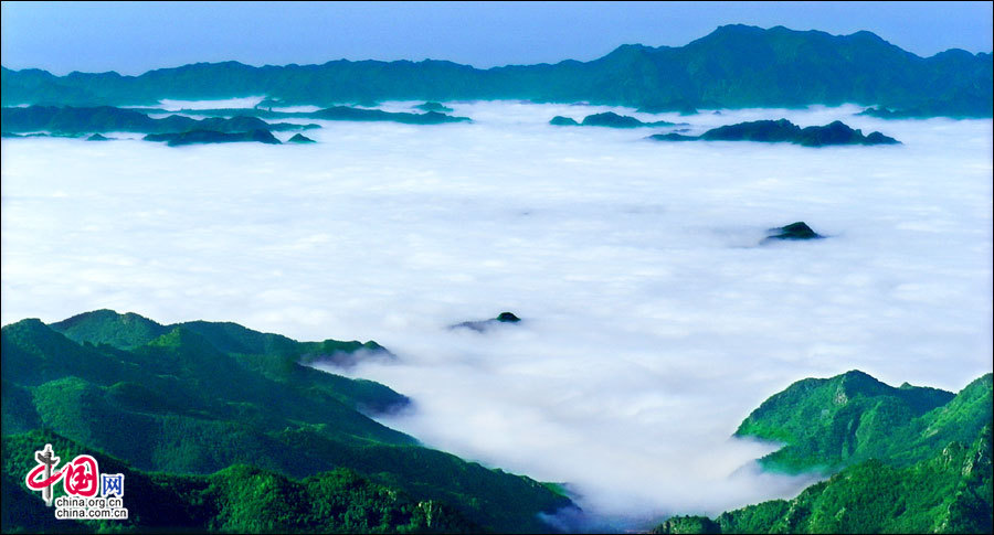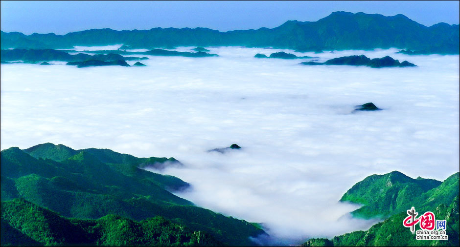 暖濕空氣上升到一定高度,遇冷凝結(jié)成云霧,形成霧靈山變幻莫測、波瀾壯闊的霧靈云海。云海在無風(fēng)之際是出奇的平靜,輕風(fēng)吹過,濺起層層浪花。風(fēng)勢稍強,便似波濤洶涌,又如萬馬奔騰,置身山巔,神思飛越,浮想聯(lián)翩,仿佛進入夢幻世界。站在頂峰遠眺,山巒在云海中出沒無常,宛若大海中的無數(shù)島嶼,時隱時現(xiàn),似真似幻,使人感到一種神奇縹緲的仙境般的美。云海中的景物若隱若現(xiàn),虛虛實實,令觀者捉摸不定,于是產(chǎn)生幽邃、神秘、玄妙之感,給人一種朦朧的美。從美學(xué)角度觀察,霧靈云海妙在似海非海,非海似海。其潔白云霧的飄蕩,使霧靈山呈現(xiàn)出靜中寓動的美感。正是在這種動靜結(jié)合之中,造化出變幻莫測,氣象萬千的人間仙境。