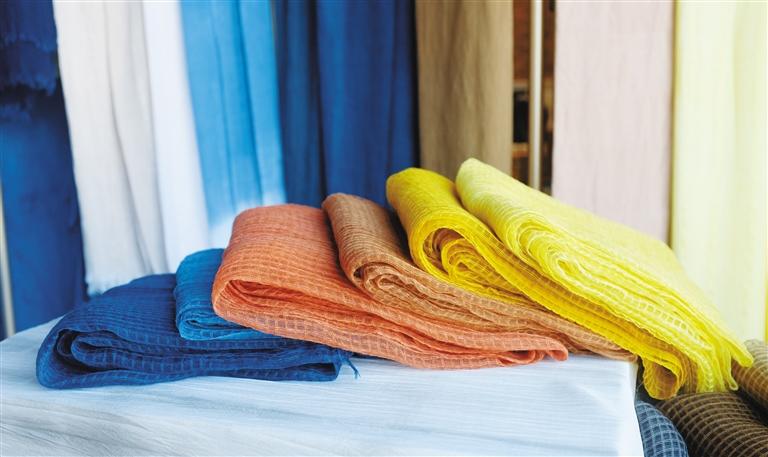 采用棉、毛、絲、麻幾種天然纖維,運(yùn)用中藥材古法染色技藝制成。使用紅花染、黃檗染、藍(lán)靛染等染制出的成品絲巾色澤亮麗,質(zhì)感舒適,天然無污染。