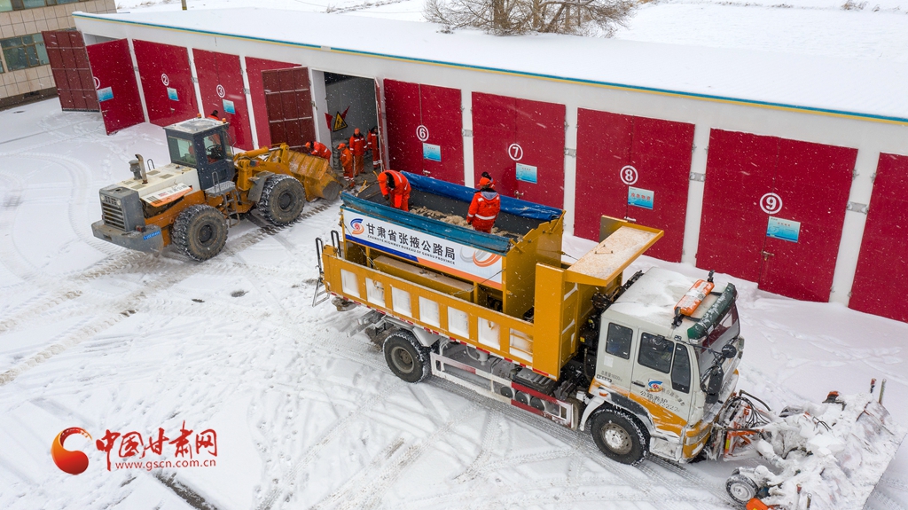 12月12日,甘肅省張掖公路局職工在裝運融雪劑。(無人機照片)
