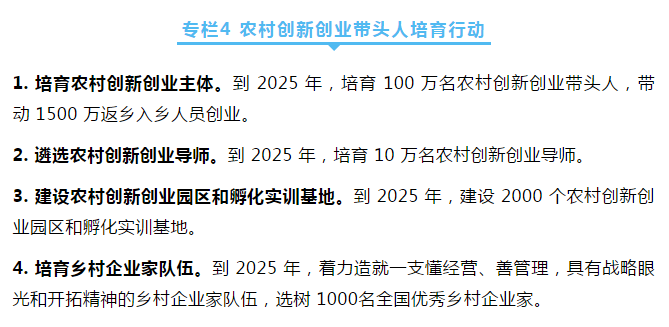 深入實施農(nóng)村創(chuàng)新創(chuàng)業(yè)帶頭人培育行動,加大扶持,培育一批扎根鄉(xiāng)村、服務(wù)農(nóng)業(yè)、帶動農(nóng)民的創(chuàng)新創(chuàng)業(yè)群體。
