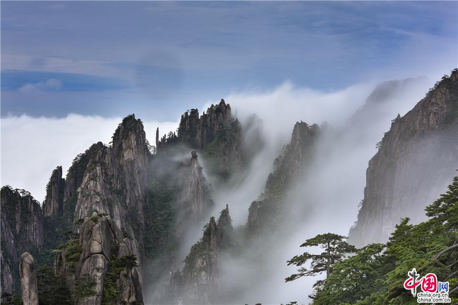 5月22日傍晚,雨后安徽黃山風景區(qū)現壯觀的云海奇觀,見云海奔騰而來,越過北海的始信峰,沿著群峰傾瀉而下勢如瀑布之壯觀,在奇群、怪石和形態(tài)各異黃山松的作用下勾勒出一幅幅流動的水墨畫;黃山不僅是云霧之鄉(xiāng),更是中國傳統水墨畫的天然的素材。(姚育青)