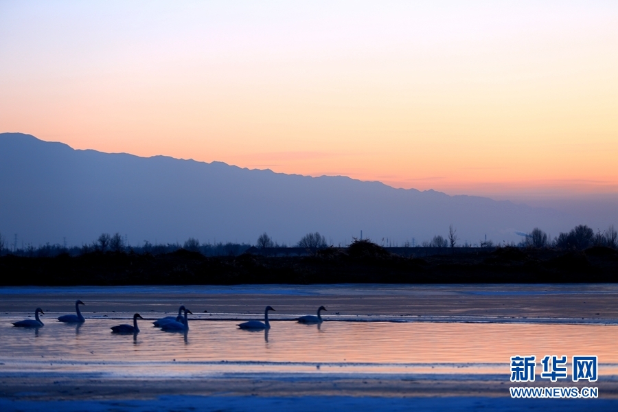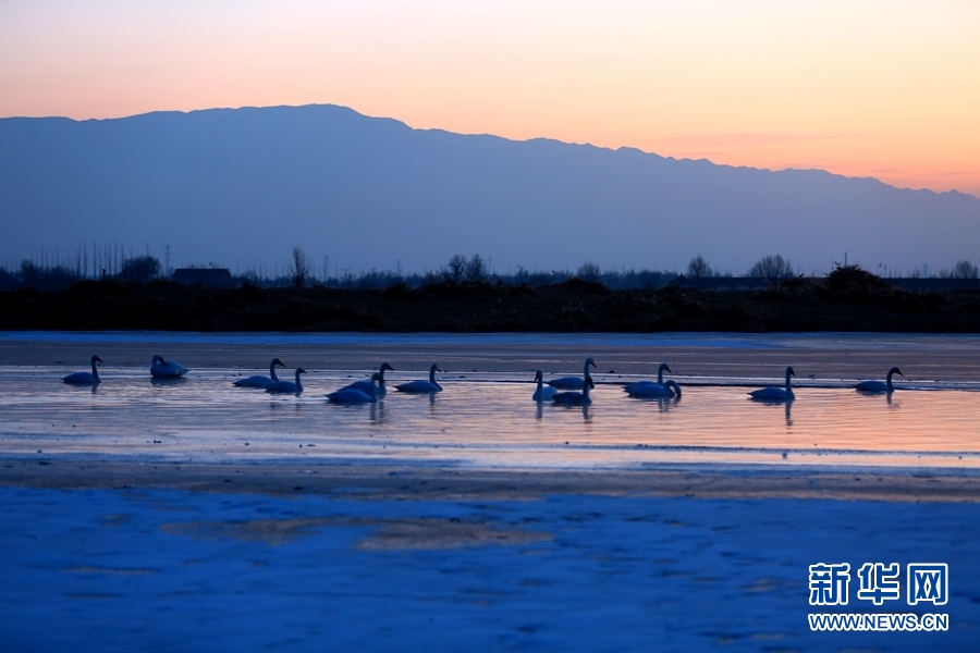 2022年1月2日,晨曦初露的甘肅省張掖市甘州區(qū)黑河流域,一群大天鵝在河中棲息、覓食,宛如一幅靜美的畫卷。新華網發(fā)(楊永偉 攝)