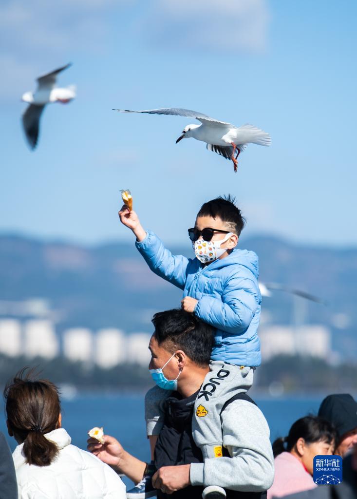 1月23日,小朋友在昆明市滇池海埂大壩投喂紅嘴鷗。