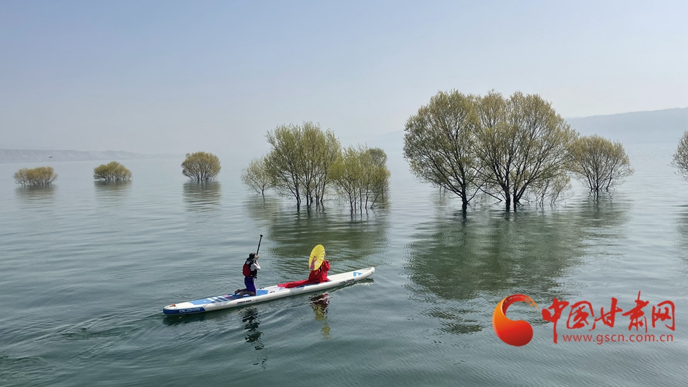 春日,炳靈湖水位上漲,碧波蕩漾,垂柳依依,槳板愛好者和游客在湖面上蕩舟嬉戲,游覽春色。