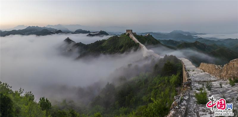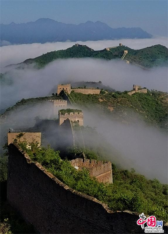 升騰的云霧中,蜿蜒的長(zhǎng)城像巨龍盤踞在云海之中,氣勢(shì)磅礴,尤為壯觀。