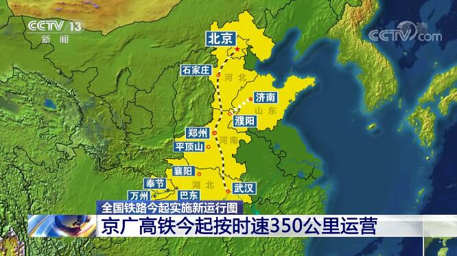 京廣高鐵從北京至武漢這一段,今天起按時速350公里運營,新型復(fù)興號智能動車組列車上線。從北京到武漢,旅行時間縮短到4小時以內(nèi)。