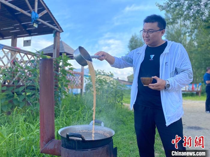7月21日,游客在牧民家體驗(yàn)熬奶茶。中新社記者 張瑋 攝
